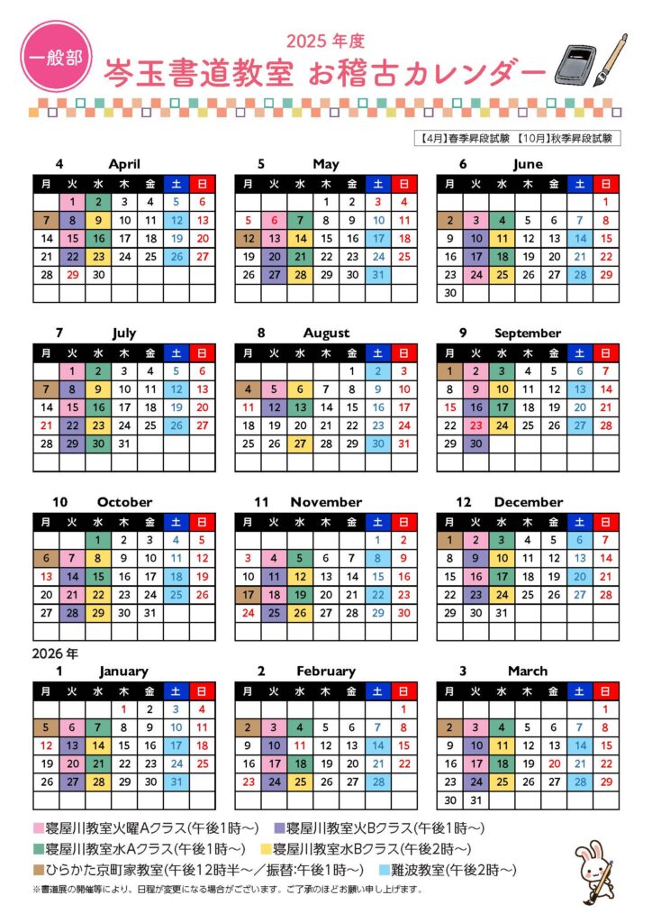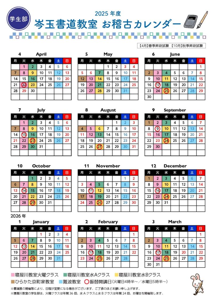 新着情報・ご連絡事項 2025年4月.5月お稽古日程 2025年3月21日 2024年度 お稽古予定日 2024年3月8日 謹賀新年 2024年1月1日 学生部のお振り替えについて 2023年11月28日 ならまち年賀状コンクール 結果発表 2023年1月26日 もっと見る→ 一般部 2025年カレンダー 学生部 2025年カレンダー 一般の部/学生の部 学生の部(4歳児から中学生まで) ⇒ 学生の部ページへ 文字を正しく美しく書く事を目標とします。 お子様の「キラリと光る個性」を伸ばし感性を豊かにする、きめ細やかな指導を致します。(毛筆/硬筆) 書道を通して、集中力、向上心、協調性等を学ぶことが出来ます。 一般の部(高校生から) ⇒ 一般の部ページへ 漢字・仮名・ペン習字・師範養成、通信講座等の部門があります。 手書きの文字は真心が伝わります。大切な方に、筆で手紙を書いてみませんか。 講師:服部 岑玉(はっとり しんぎょく) はじめまして。講師の服部岑玉と申します。 三ケ所にて、お稽古を開催しております。 寝屋川教室(於香里園駅・火曜日・水曜日) ひらかた京町家教室(於枚方公園駅・第1月曜日) 難波教室(於難波駅・第2.第4土曜日) ※どのお教室も、正座でなく椅子でお稽古が可能です。 日本書作研究連盟師範、毎日書道展佳作賞受賞 ⇒ 講師ページ お気軽にお問い合わせ下さい 是非一度お教室をご観覧下さい。 ご観覧、お申し込みの際は事前に、お電話かメール(フォーム)にて予約が必要です。 ⇒ 詳しくはお問い合わせページへ