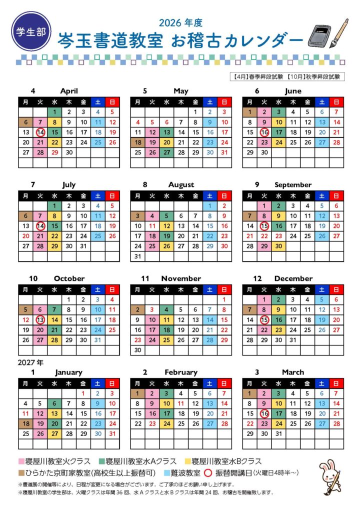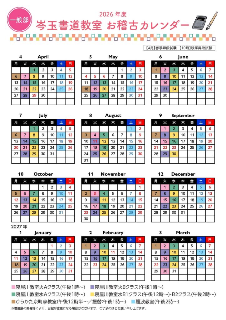 新着情報・ご連絡事項 2026 2026年1月1日 2025年4月.5月お稽古日程 2025年3月21日 謹賀新年 2025年1月1日 2024年度 お稽古予定日 2024年3月8日 謹賀新年 2024年1月1日 もっと見る→ 一般部 2026年カレンダー 学生部 2026年カレンダー 一般の部/学生の部 学生の部(4歳児から中学生まで) ⇒ 学生の部ページへ 文字を正しく美しく書く事を目標とします。 お子様の「キラリと光る個性」を伸ばし感性を豊かにする、きめ細やかな指導を致します。(毛筆/硬筆) 書道を通して、集中力、向上心、協調性等を学ぶことが出来ます。 一般の部(高校生から) ⇒ 一般の部ページへ 漢字・仮名・ペン習字・師範養成、通信講座等の部門があります。 手書きの文字は真心が伝わります。大切な方に、筆で手紙を書いてみませんか。 講師:服部 岑玉(はっとり しんぎょく) はじめまして。講師の服部岑玉と申します。 三ケ所にて、お稽古を開催しております。 寝屋川教室(於香里園駅・火曜日・水曜日) ひらかた京町家教室(於枚方公園駅・第1月曜日) 難波教室(於難波駅・第2.第4土曜日) ※どのお教室も、正座でなく椅子でお稽古が可能です。 日本書作研究連盟師範、毎日書道展佳作賞受賞 ⇒ 講師ページ お気軽にお問い合わせ下さい 是非一度お教室をご観覧下さい。 ご観覧、お申し込みの際は事前に、お電話かメール(フォーム)にて予約が必要です。 ⇒ 詳しくはお問い合わせページへ